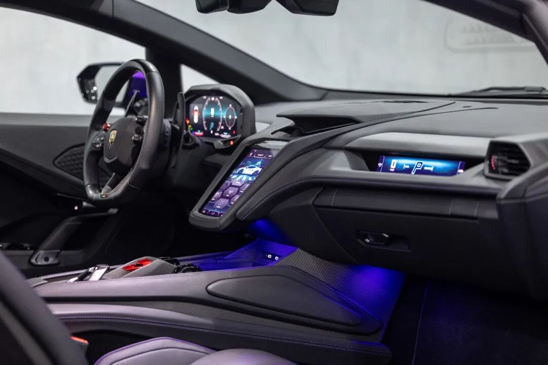 当然,大涡轮的使用也会有低速响应不及时的问题,为了解决涡轮迟滞,常见的大众车型都会采用小惯量涡轮。而Temerario的做法是要化敌为友,将电动机低速传输直接的优势拿过来,这也就是我们现在看到的全新完整的动力系统,V8涡轮增压发动机加三电机的布局,和大牛Revuelto一样,每台电机功率是110千瓦。位于发动机和变速器之间的电机有300牛米的扭矩输出,用来弥补低速下的涡轮迟滞,同时也能在逼近万转过程中让加速更为线性。这些优势在赛道中会被放大,每次出弯后的加速顺滑、响应且及时,动力是否能跟得上已经不是驾驶者所考虑的事情,这才是油电协同配合下新时代超跑的正确打开方式。而前轴的双电机总功率是220千瓦,想要达到2150牛米的峰值扭矩,持续输出功率是60千瓦,它最大的作用是要让这台车能实现电控四轮驱动,并搭载兰博基尼LDV车辆动态控制系统2.0,利用电驱动扭矩矢量分配系统来调节每个车轮的扭矩。