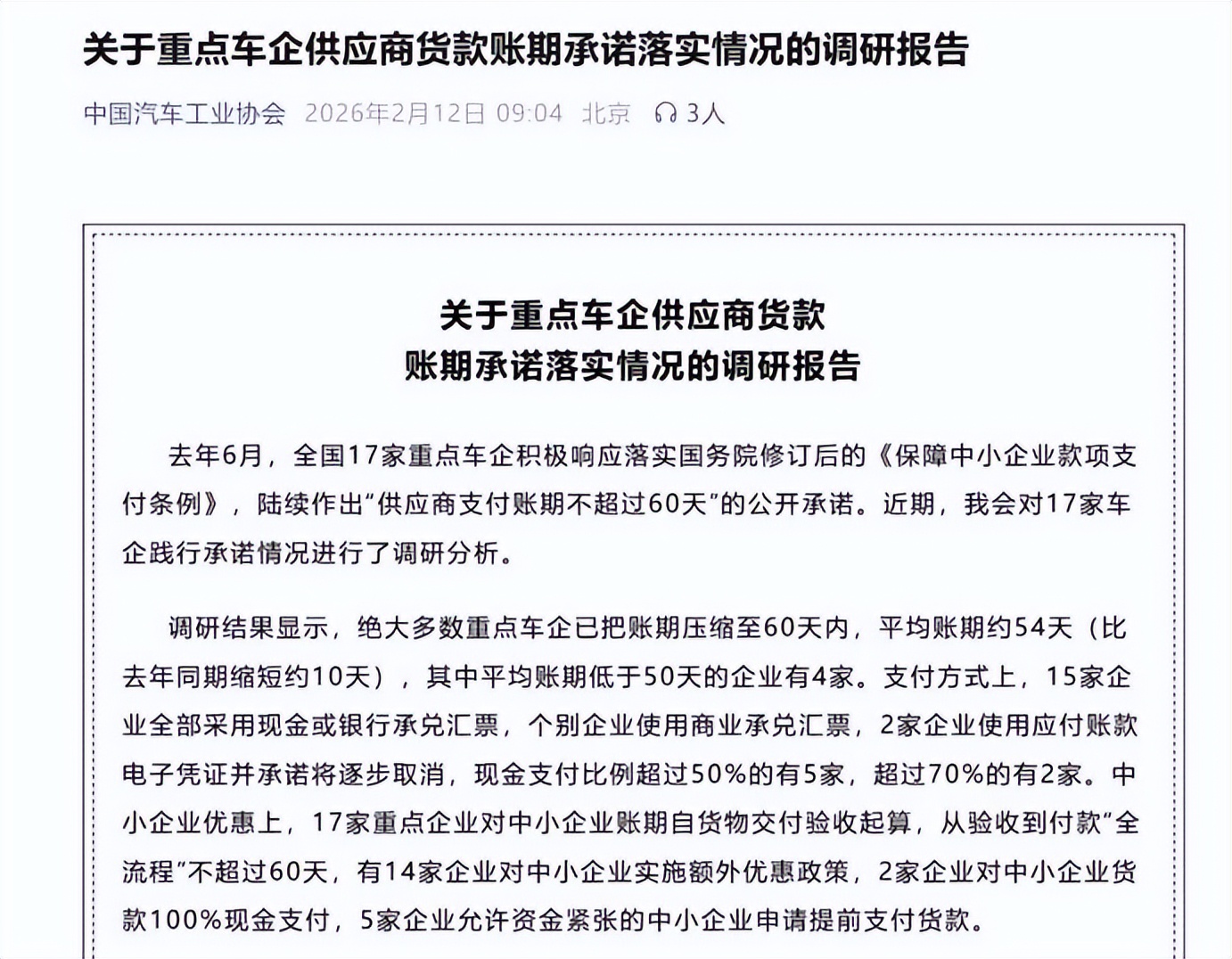 2026年2月12日,中国汽车工业协会发布的一份调研报告揭示了汽车行业“反内卷”战役的关键进展:去年6月积极响应《保障中小企业款项支付条例》并作出“支付账期不超60天”承诺的17家重点车企,绝大多数已完成账期压缩,平均账期降至54天,较去年同期缩短10天。